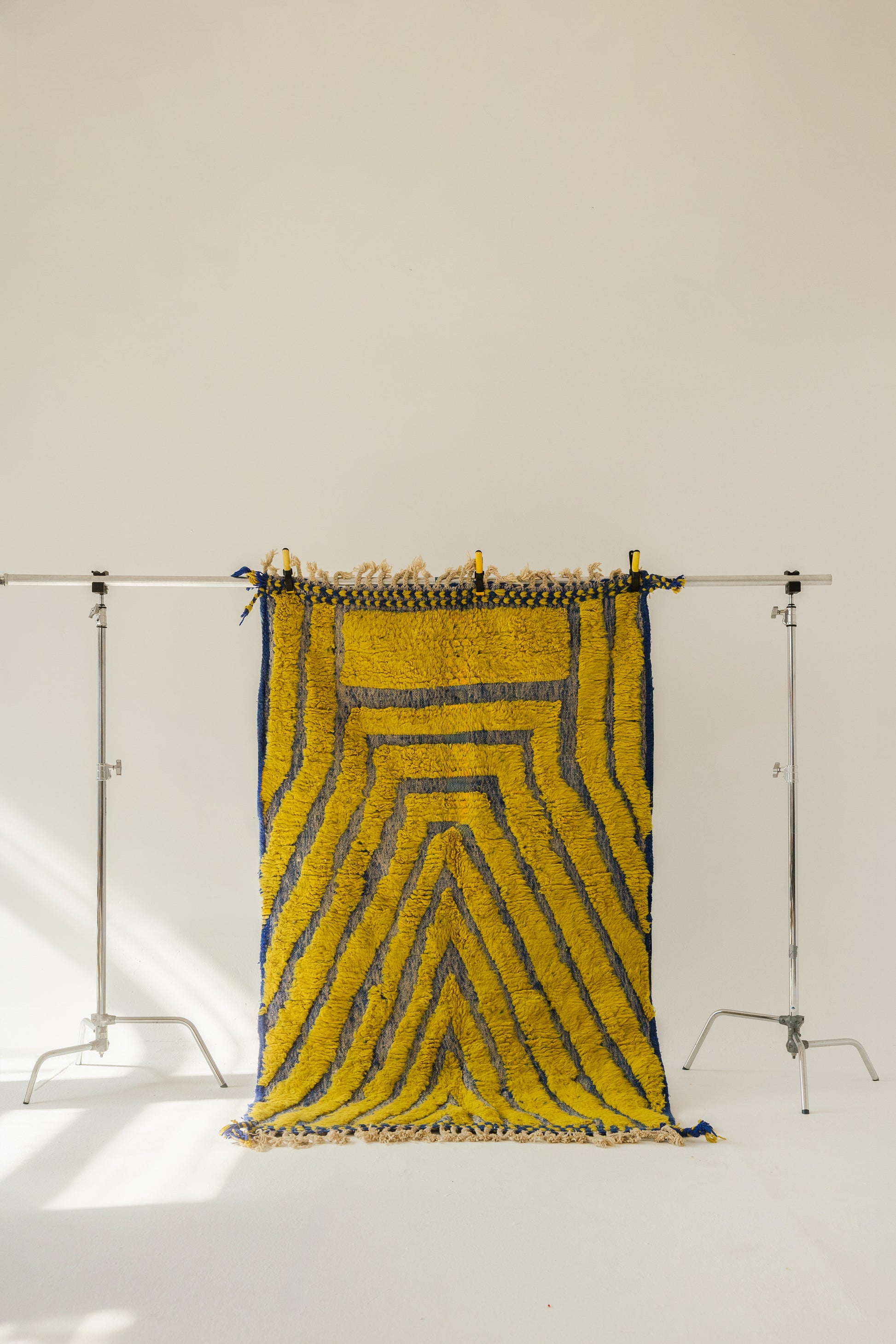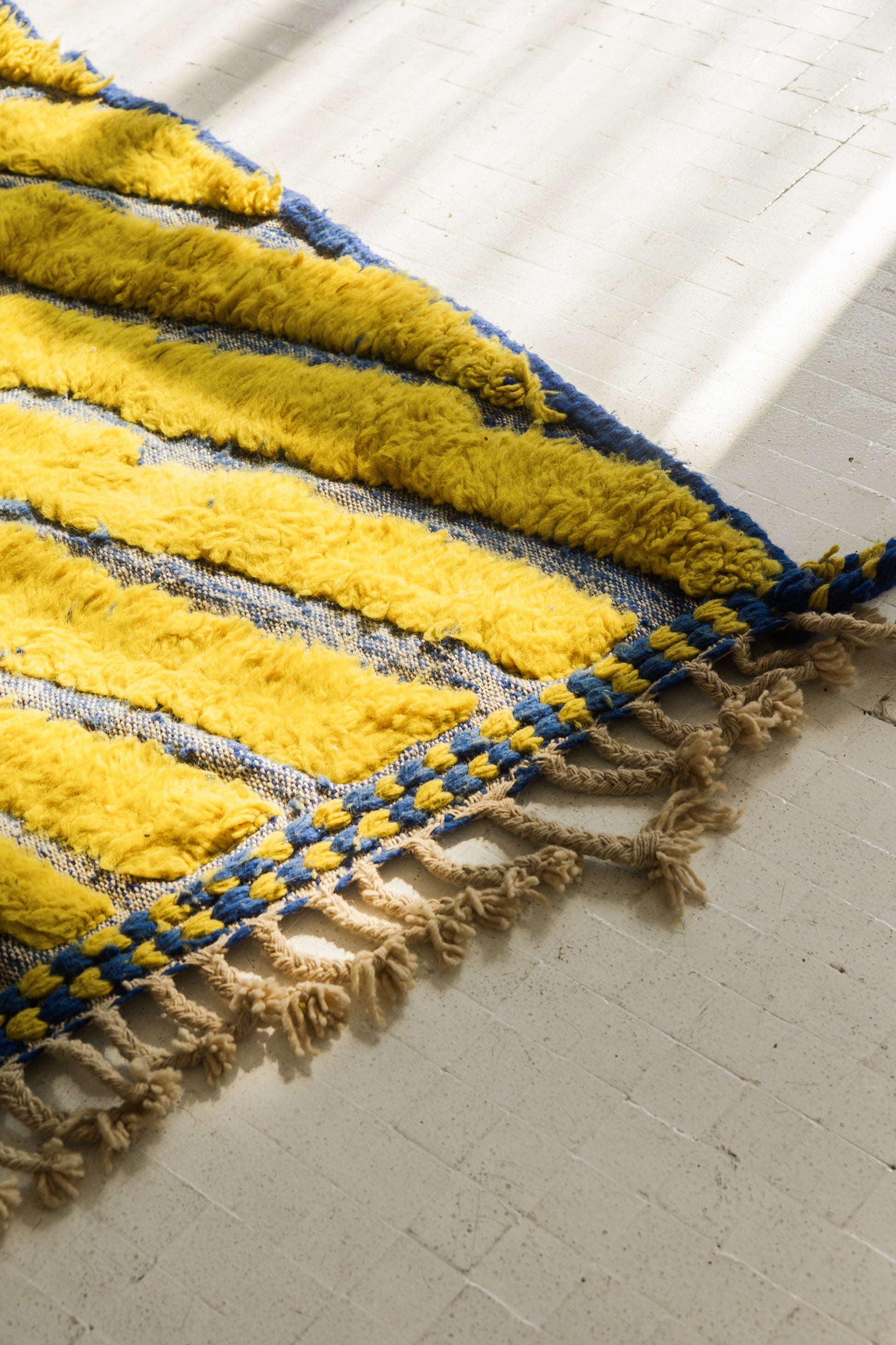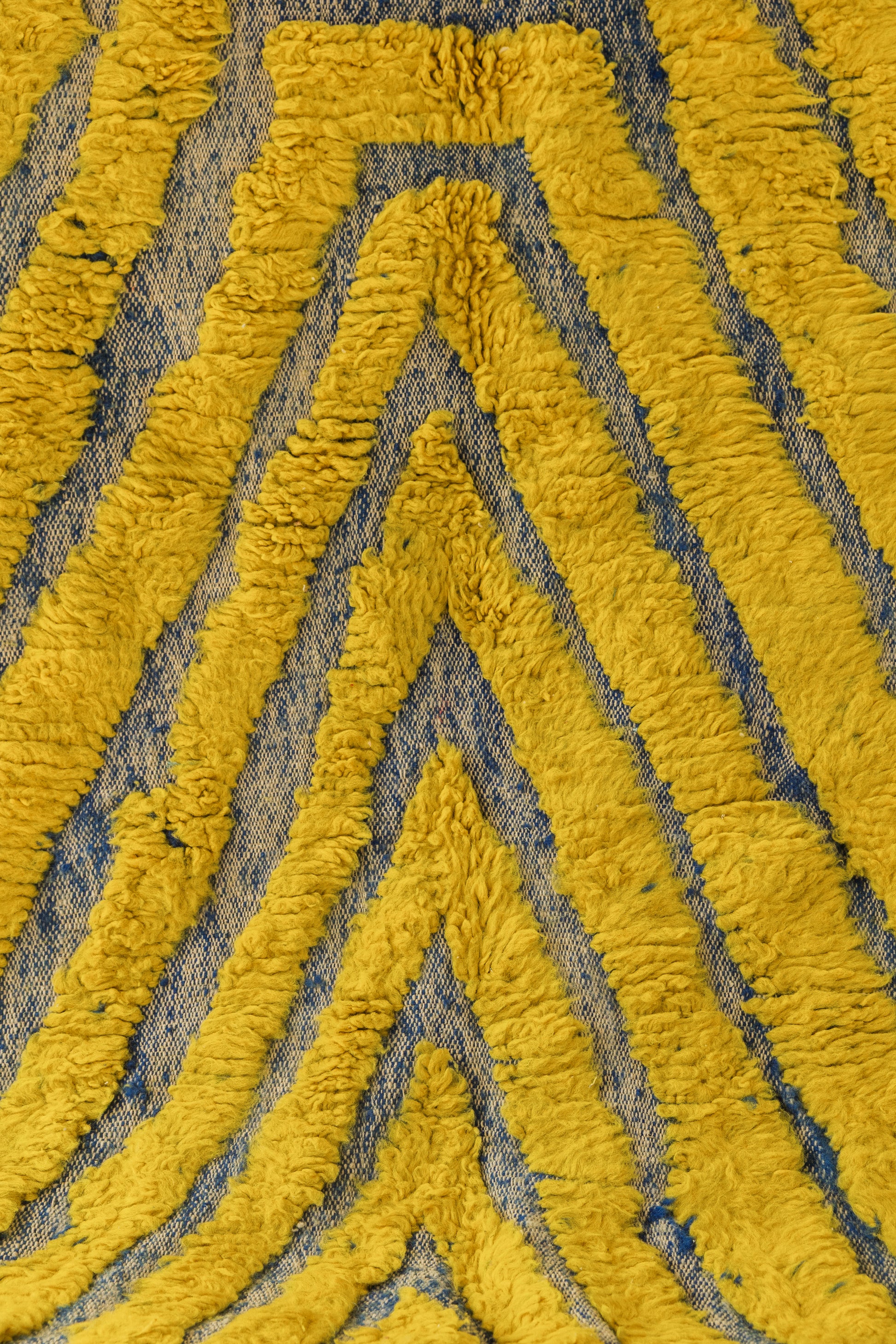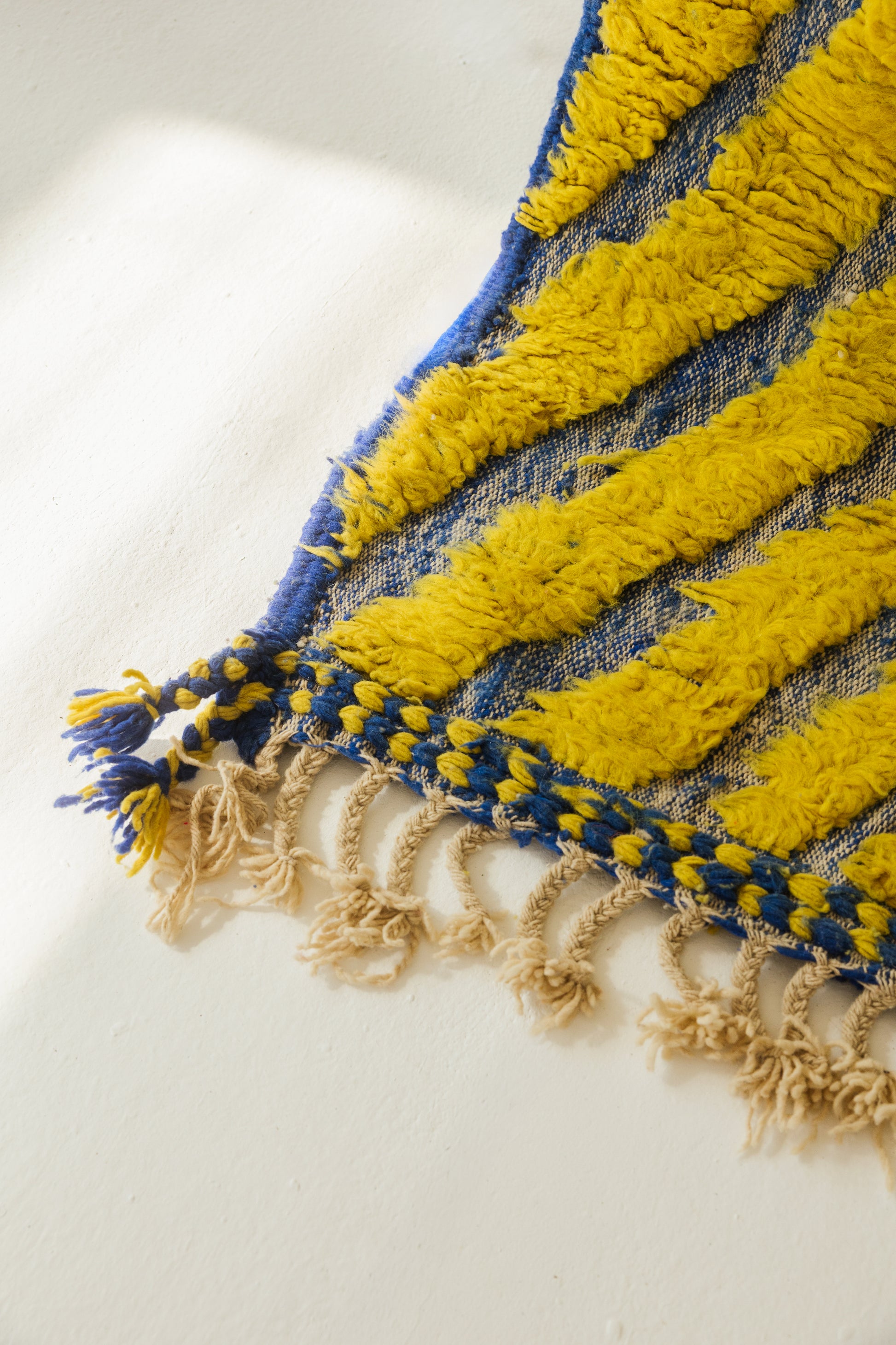A Berber rug featuring a bold, geometric pattern in shades of yellow and blue. The soft, fluffy pile ensures everyday comfort, while the inspiration from traditional Moroccan motifs brings an authentic character to the interior. It will fit perfectly in a living room, bedroom, or relaxation zone.